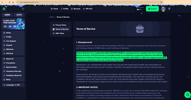 Il documento pubblicato sul sito web acey.live indica InterStorm (Curaçao) NV (numero di registrazione della società 137453) come titolare della licenza e fa riferimento al numero di licenza OGL/2024/106/0170 , affermando che la licenza è stata rilasciata il 07.06.2025 e che il suo stato attuale è ATTIVO. Tuttavia, queste informazioni non sono coerenti con lo stato della licenza visualizzato sul sito web ufficiale della Curaçao Gaming Authority (GCA).