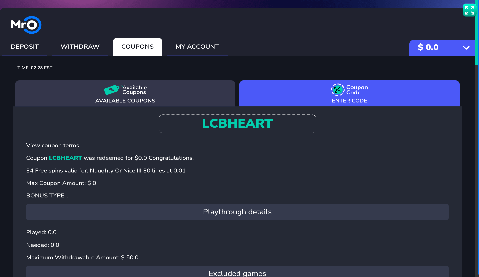 Worked for me thanks bud I gotta recurring that works every single day for mr.o if you deposit 20$ it's "Spinblast" it will work every single day as long as you've made 20$ in deposits that day it's 50$ mco 50 spins clue mystery slot