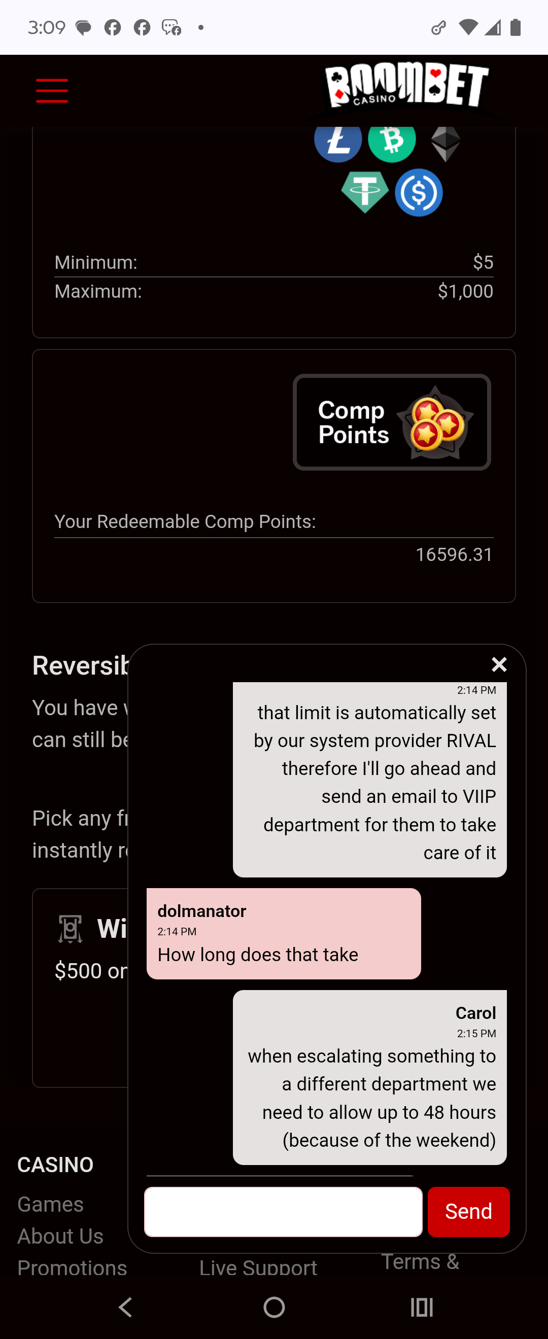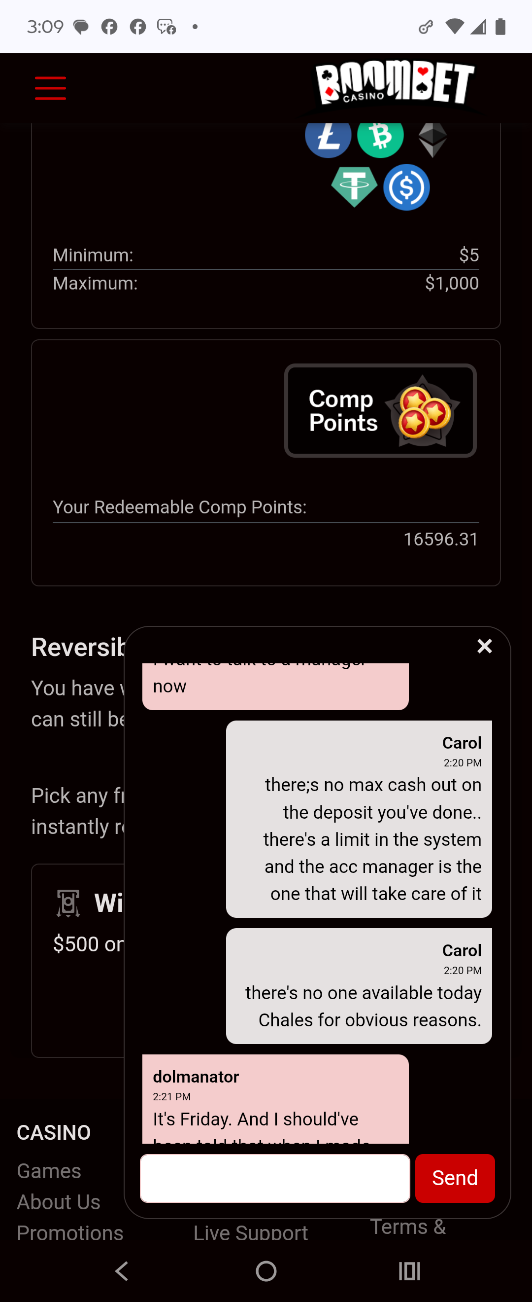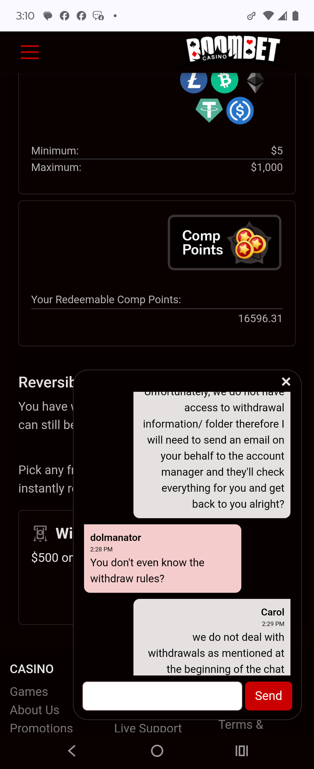 I was told if I deposit $250 that there was no restrictions on game play and no max on withdraws. I was also told that if I lose my deposit then I would receive 100% cashback. I was told 0x playthrough on my deposit and 1x playthrough on the cashback