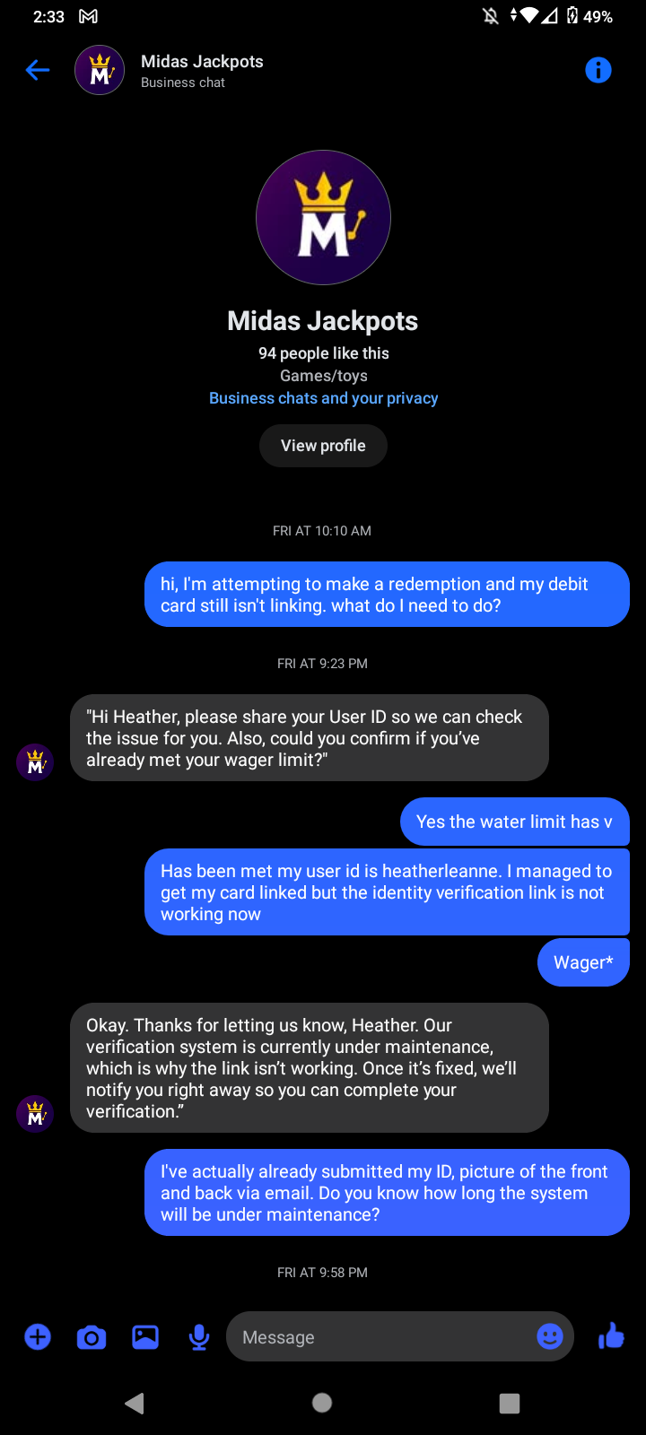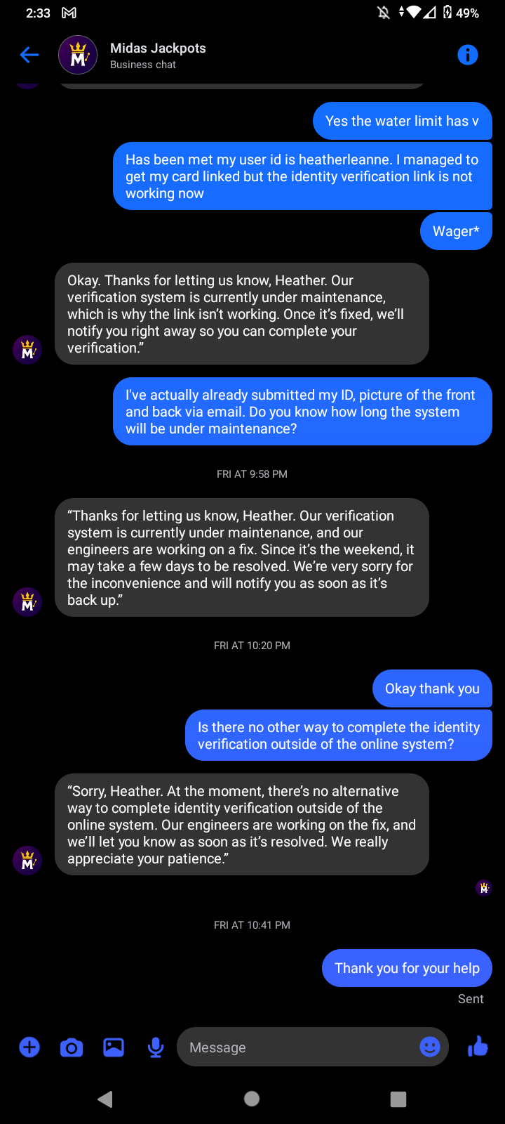 I'm unable to complete my identity verification because the link provided does not work. I have created a ticket and emailed customer support and still have received no response.