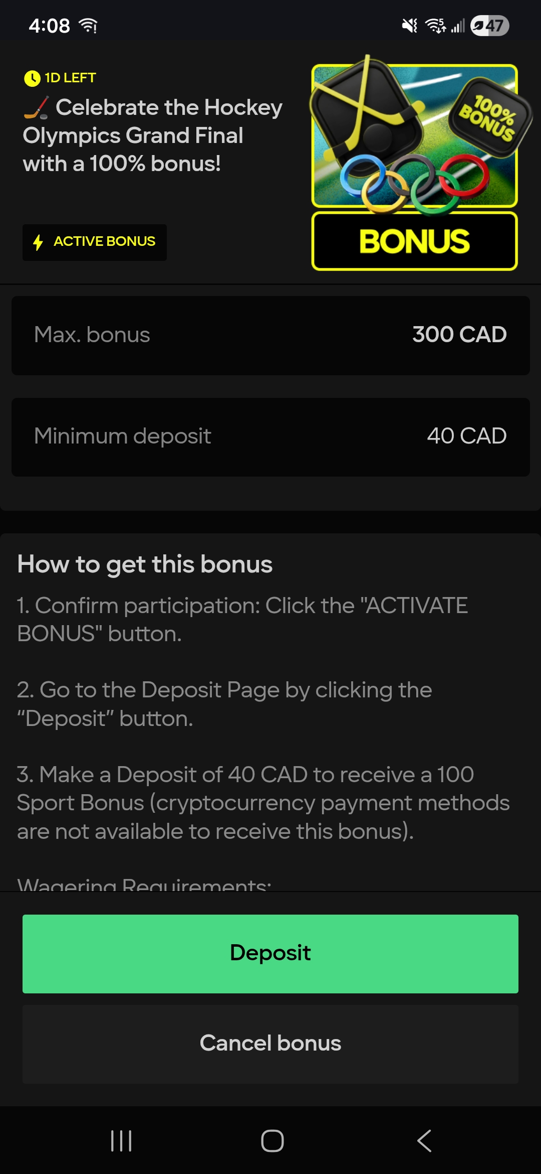 Here's where tthings get fun. They have terms and conditions stating that all deposits need to be played through 1x prior to a withdrawal for anti money laundering rules. That's fine, but I wouldn't have deposited had I known they would not honor the bonus right? So I made two bets to try to play the 1x requirement, both of course lost. So now my deposit was gone, and no 100% bonus was activated.