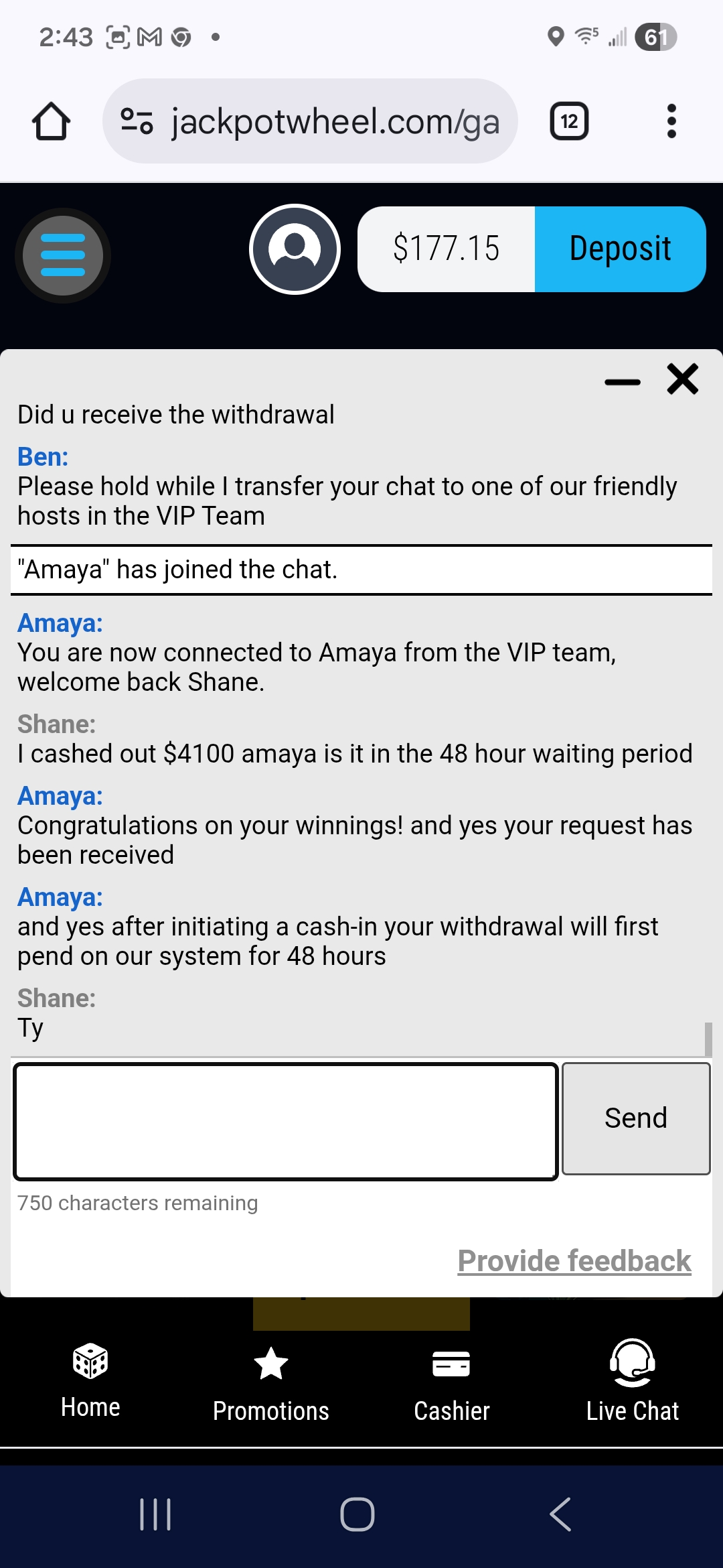 Jackpotwheels has denied me a 4100 dollar withdraw after they gave me bonus credits and I met the 6100 dollar playthrough and payed the wages back it let me cash out 4100 I got a puc of the rules with the bonus money.I put this picture in an a.i identifier and this is what it said.This is Vip specialist congratulating me on my winnings knowing I won the money doing exactly what there direction's said.And a pic of my withdraw.