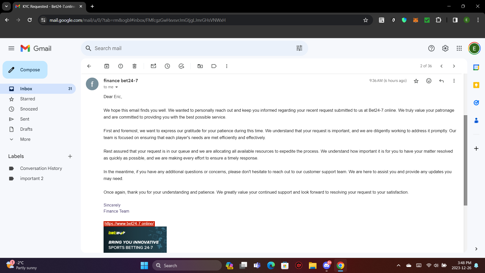 no i havent received the winnings yet i think the email was jsut a stall tacic thing tbh it was there finaicial one tht they had contacted me from when they requested my documents they replied once after 3 weeks practiacly so yea im not holding my breath i think its up in the ss aboiove there but it was there finance@ bet24-7.online